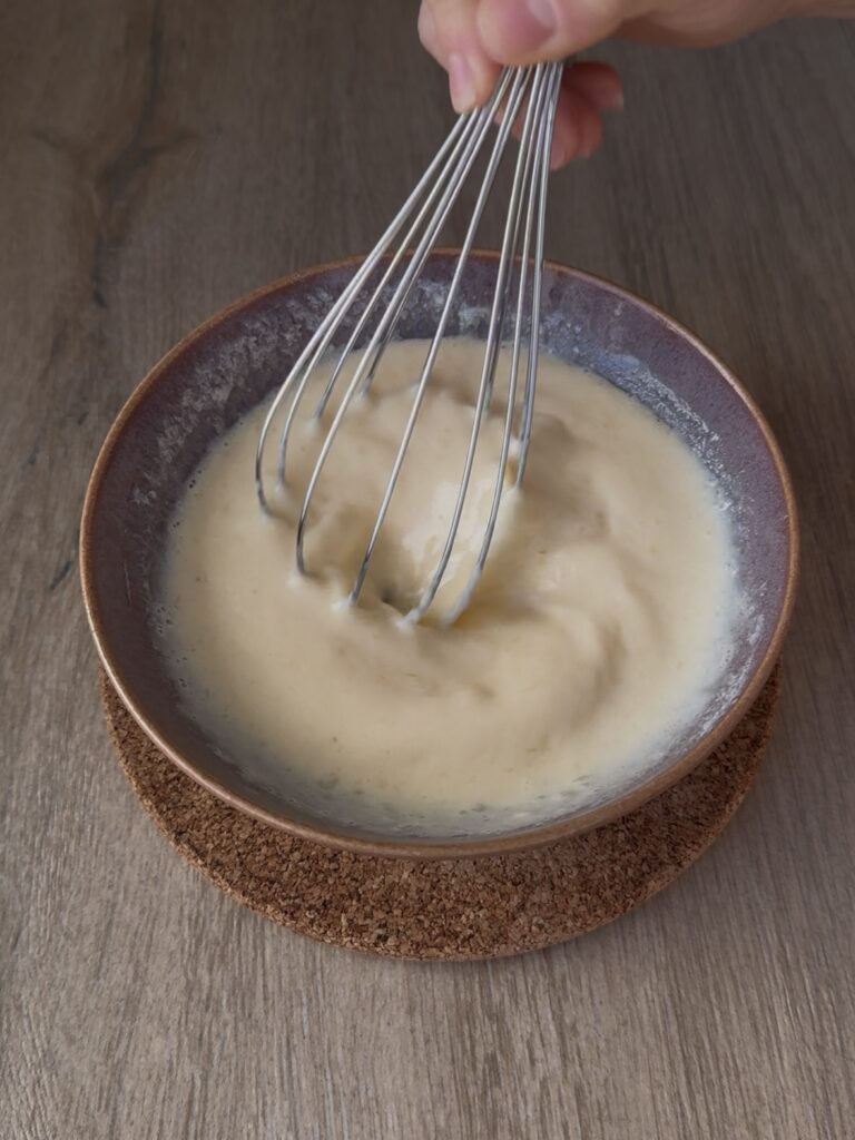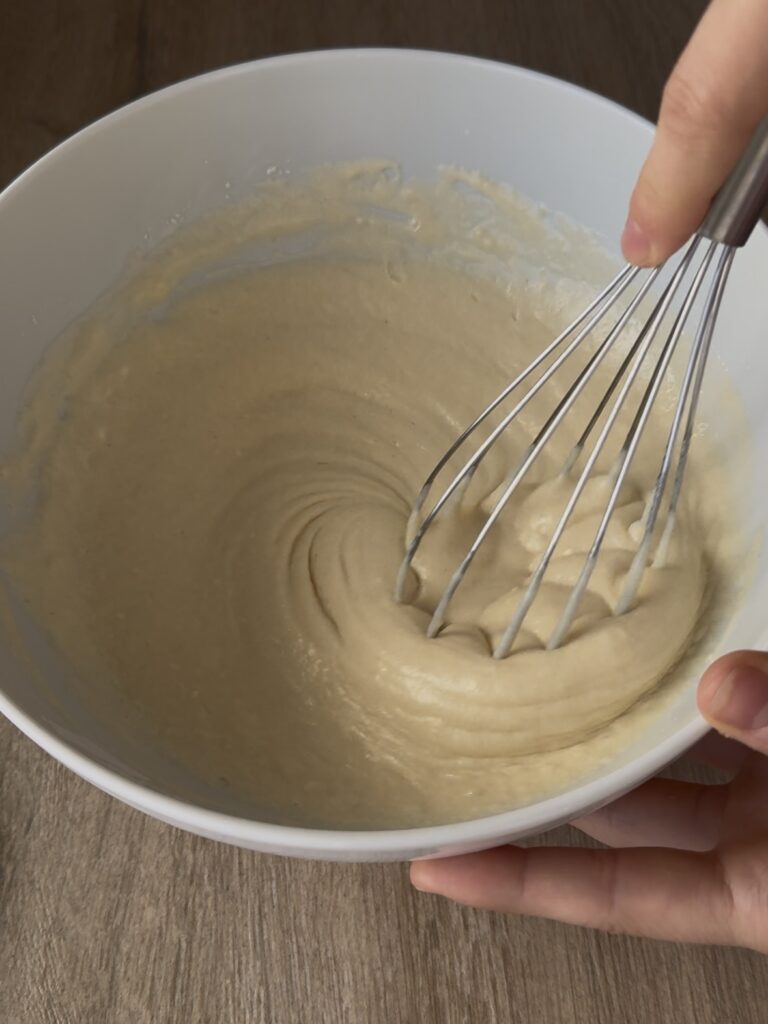 5. Añade la mezcla de líquidos a la mezcla de secos. Mezcla con las varillas hasta que no quede harina, sin sobremezclar. Tiene que quedar una mezcla bastante espesa.