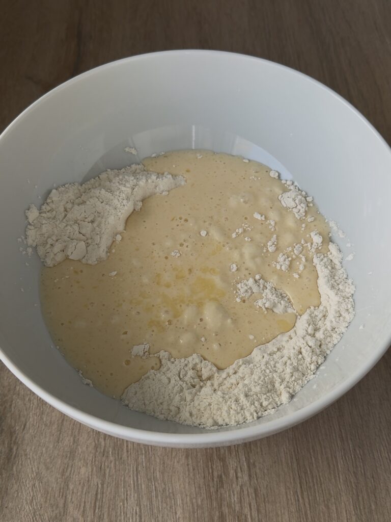 5. Añade la mezcla de líquidos a la mezcla de secos. Mezcla con las varillas hasta que no quede harina, sin sobremezclar.